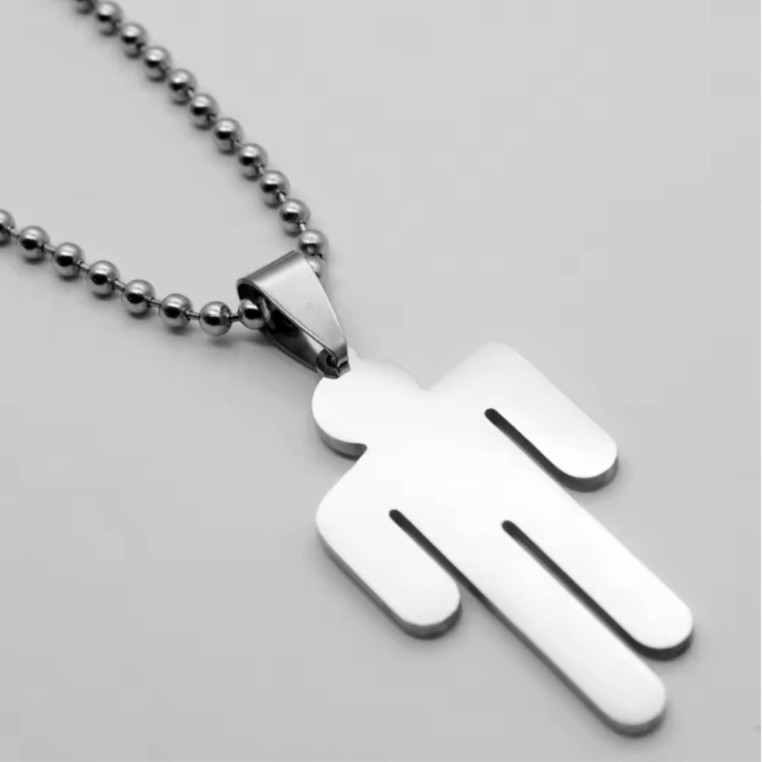Collar inspirado en Billie Eilish con colgante del icónico logo Blohsh, la silueta inclinada que representa su estilo único. Fabricado en Acero Quirúrgico 316L, resistente, hipoalergénico y duradero. Disponible en plata y oro. Unisex, ideal para fans de Billie Eilish y la música alternativa.